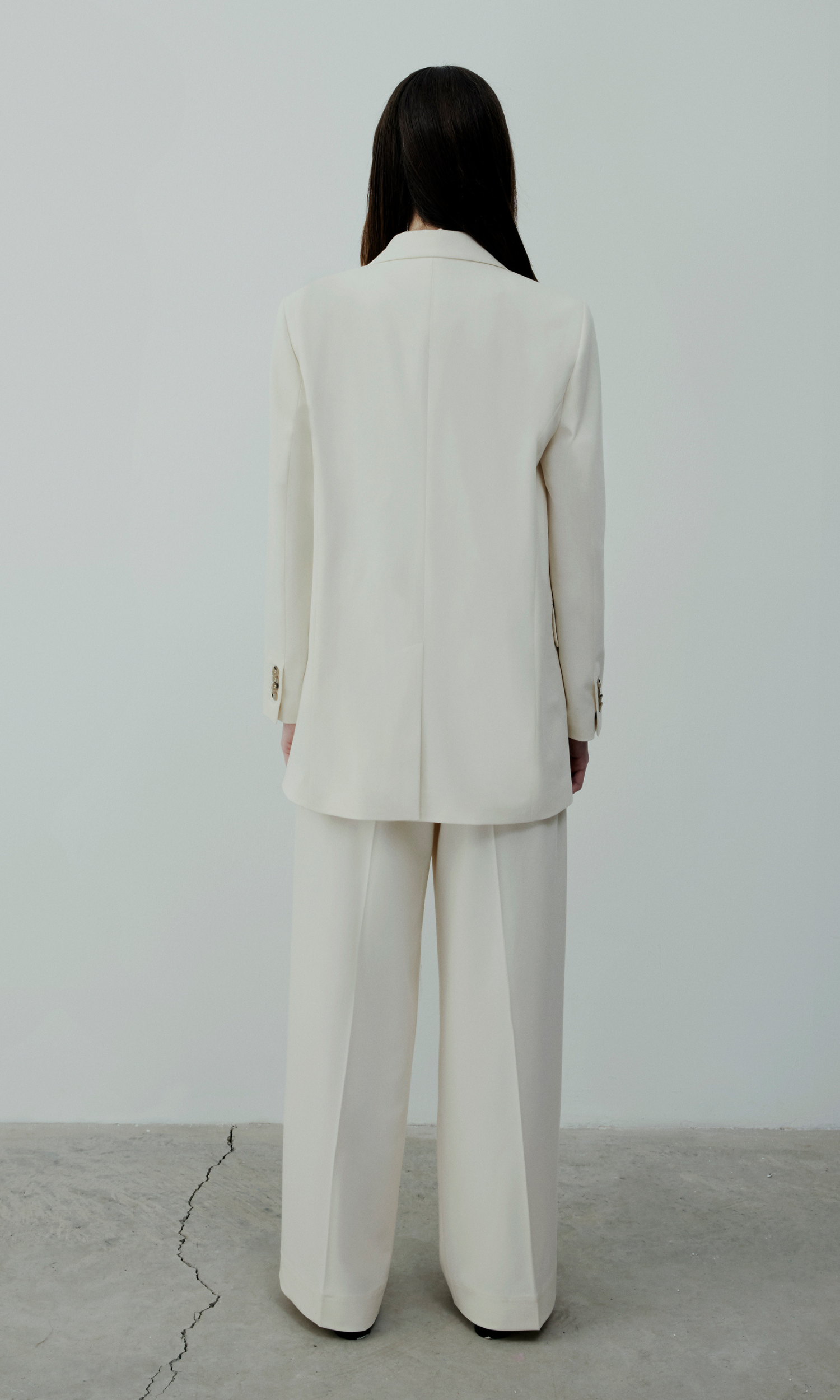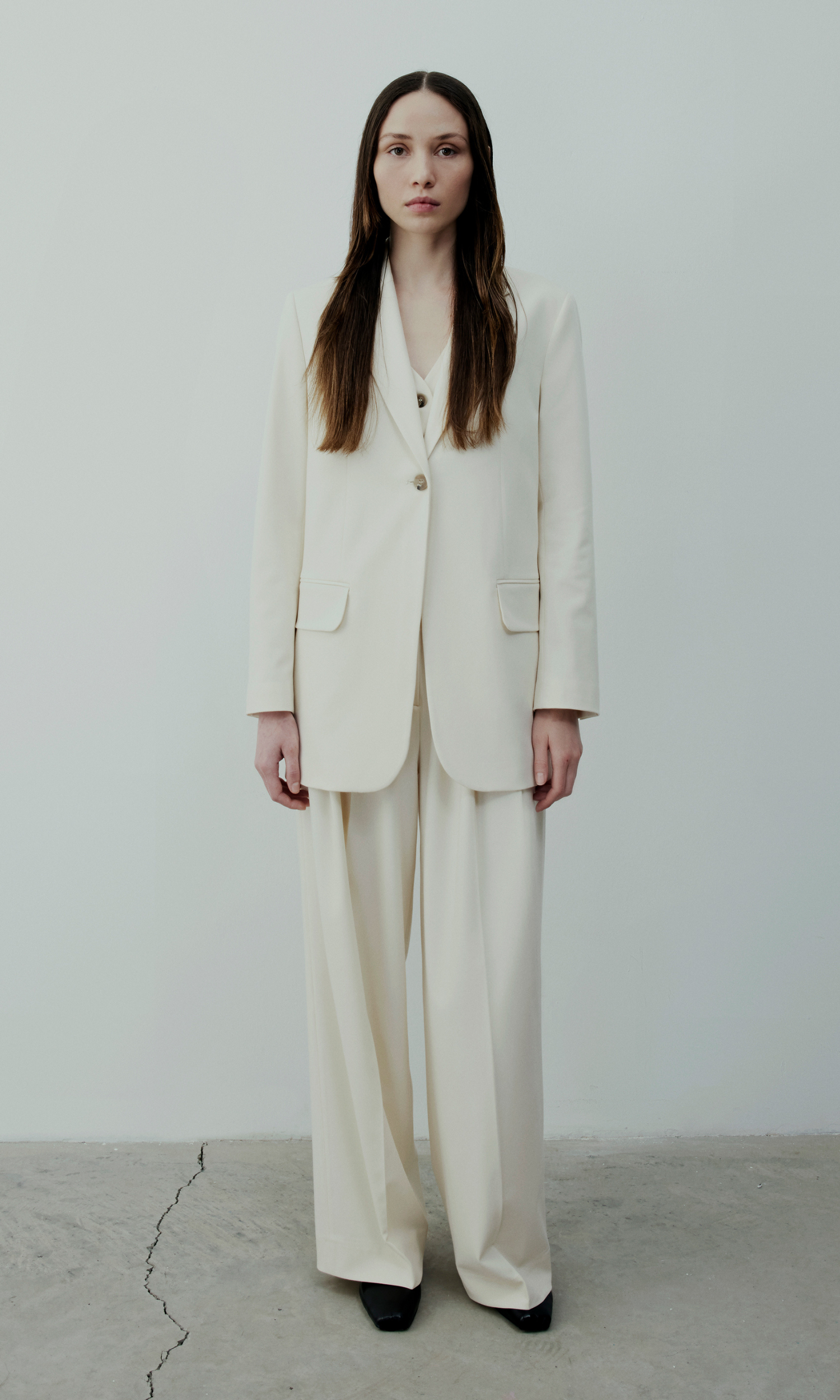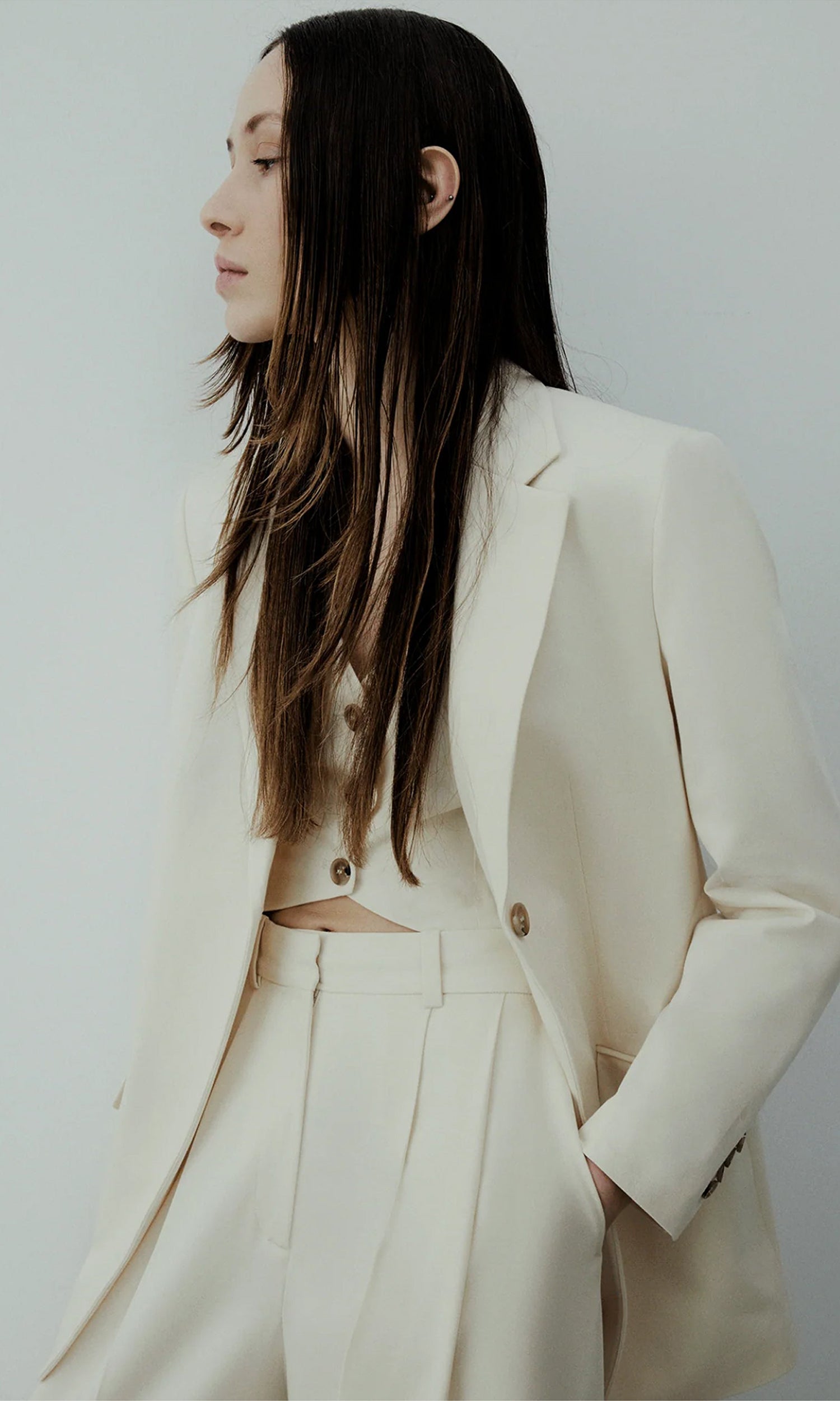 The oversized blazer is designed with a fitted, elongated silhouette and a constructed, single-button detailed with welt pockets with flaps and vents at the back.
