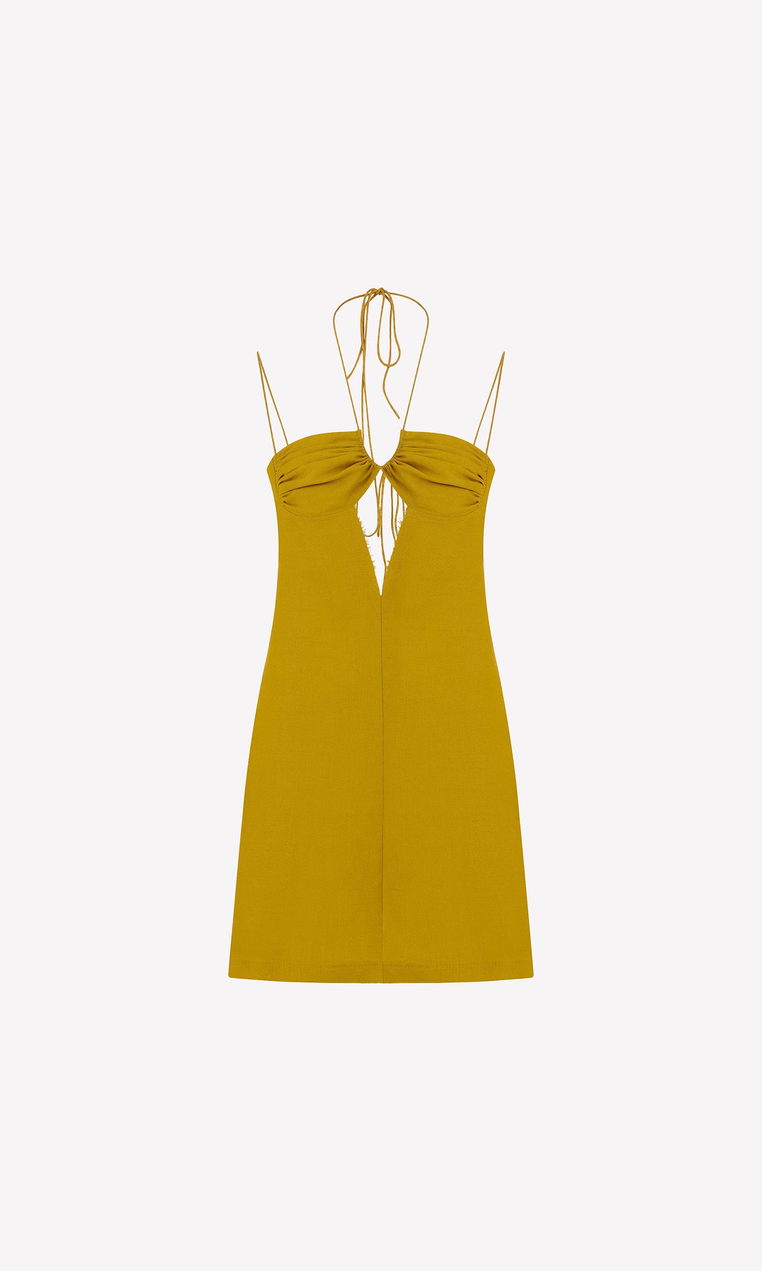 The striking diamond-shaped cutout is just one of the geometric details that make this summer dress so special. Double laces made of fine walking laces, finished with a rubber-covered knot, secure the low triangular back with raw edges and overlock stitching.